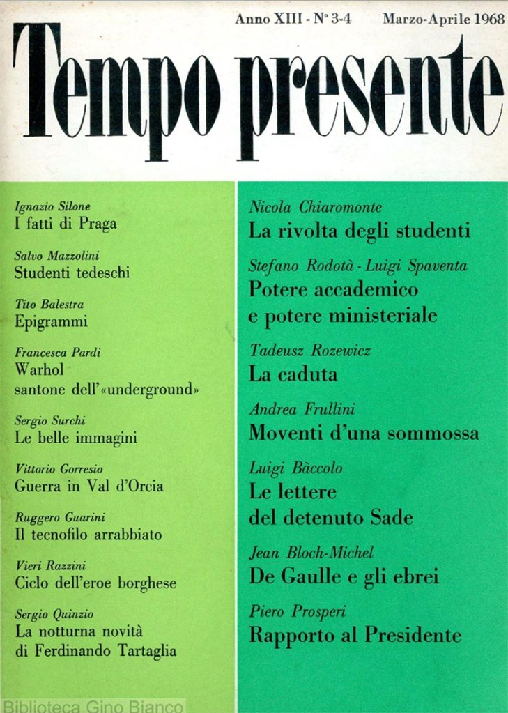 E poi: tutto questo bisogno d’ortodossia, è un bisogno effettivamente sentito? E da chi? Se osserviamo gli uomini intorno a noi, si direbbe che non è proprio per l’assenza d’una qualche ortodossia che soffrono – salvo, naturalmente, le diverse categorie di clienti dello Stato, o aspiranti tali. Al contrario, la nostalgia di un sistema rassicurante non è forse uno dei tratti essenziali della debolezza della nostra epoca?